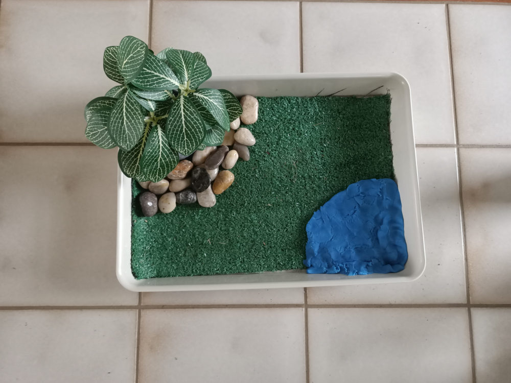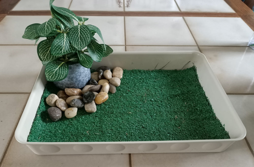 - Position the artificial plant in corner of tray. If you are using items from your garden I suggest using some Play-Doh as the base to help it stay upright.