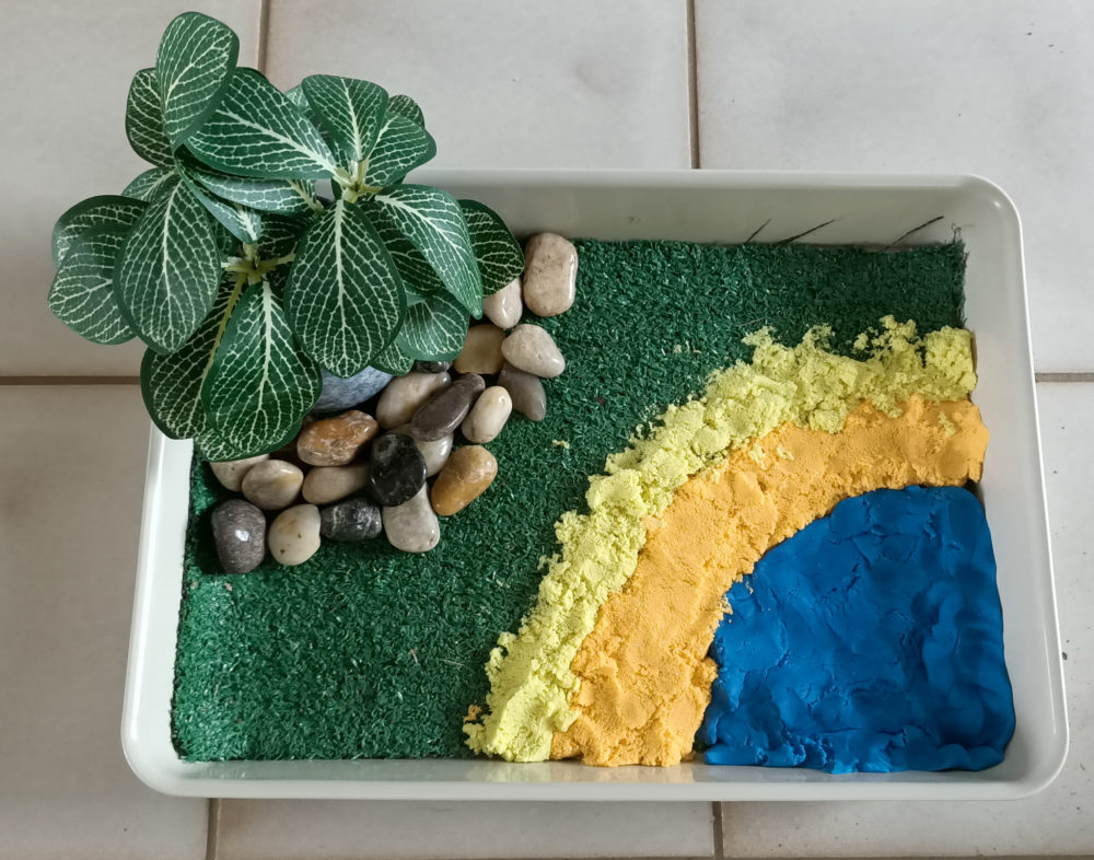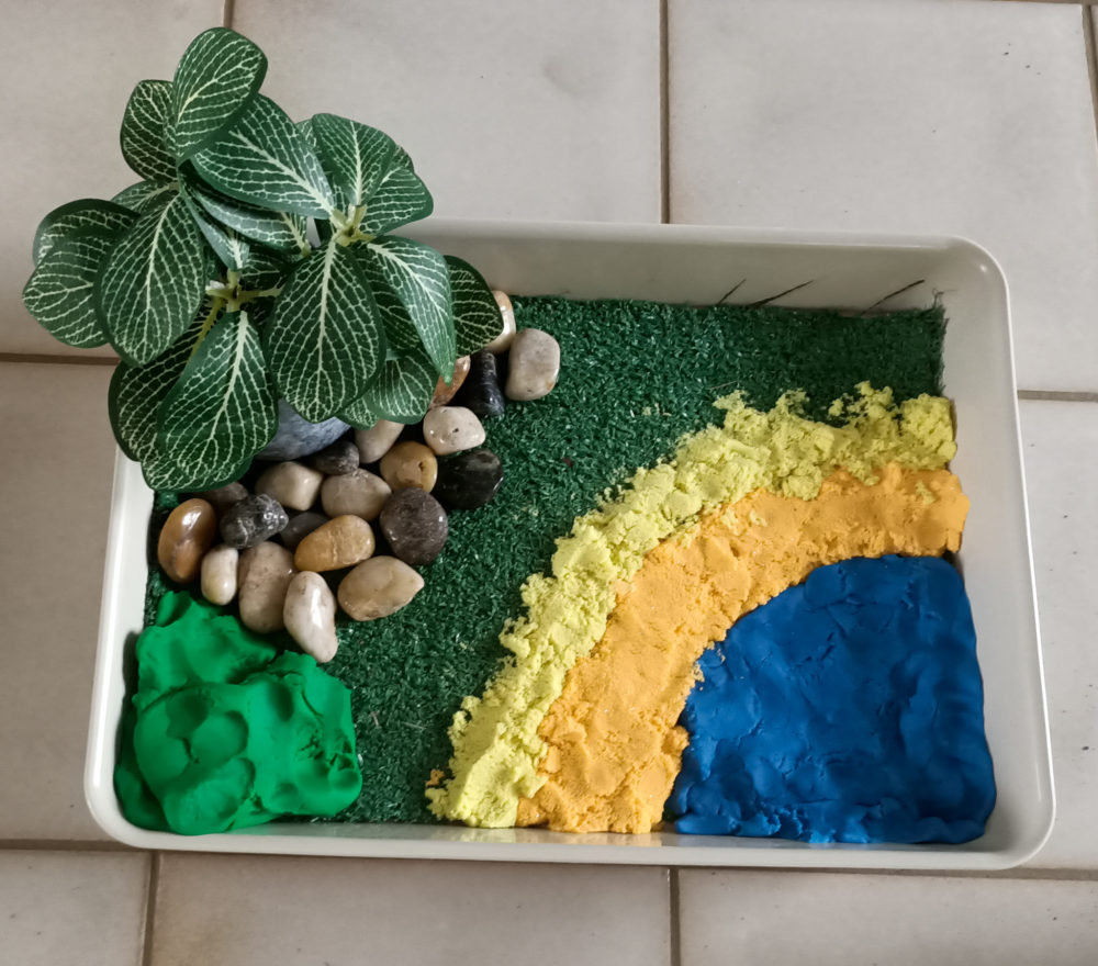 - Decide where you want your “water” to go. In this case I have made a creek in one of the corners with one of the Play-Doh tubs.