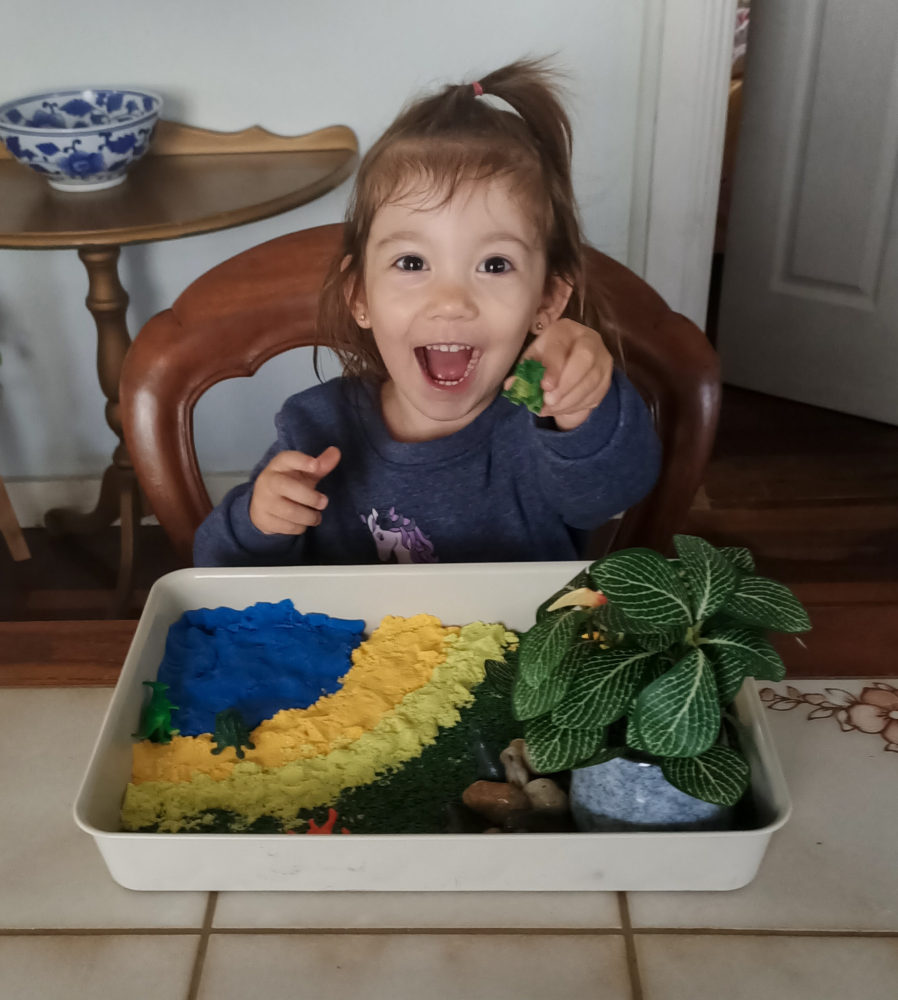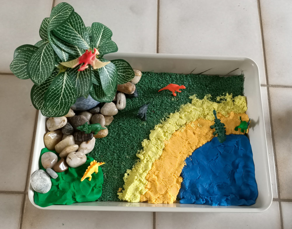 - Add animals around the tray. Keep to using only a few, so as not to overwhelm them. I chose dinosaurs as our daughter is into dinosaurs at the moment.