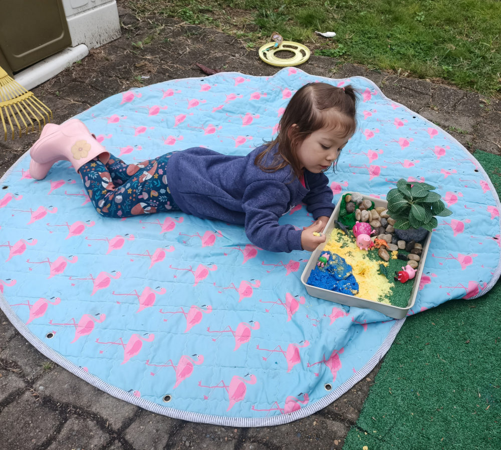 After a nap and a chat I sat our daughter down at the dining table and brought out the dinosaur sensory activity that was now set up for play. Her first reaction was excitement, then hesitation. She loves a chat, so we discussed all the different bits inside the tray and I started playing with the dinosaurs to show her what she could do. She was a bit hesitant at first, but once we went into the garden and added Peppa Pig and George to the mix, the fun took off. We mixed sand with the “water” to create an ocean, the “mountain” suddenly became a rock covered cave and all the dinosaurs were George’s pets.